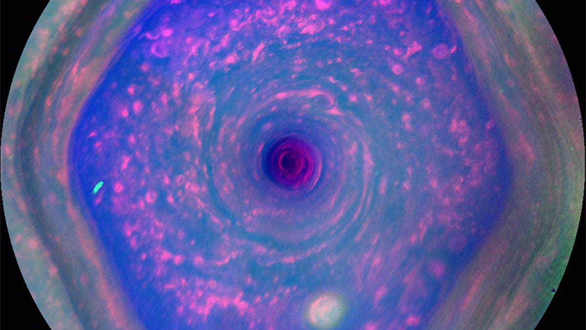 A bizarre, funnel-shaped cloud formation churning around Saturn's north pole was first noticed in the 1980s in Voyager flybys. Eventually, this mass became known as "the hexagon."