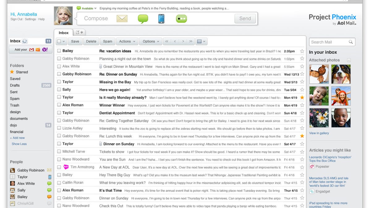 The full AOL Project Phoenix release will come next year, but at the moment is in a limited beta phase. Here's the lowdown: It looks a lot like Gmail's interface, with a few extra bells and whistles. There's a "quick bar" at the top for sending short e-mails, instant messages (which pop up in very Google Chat-like windows), and text messages. A side bar of "smart view" content previews attached files and maps of locations detailed in the message (AOL representatives assured that these previews only show up from confirmed contacts, so there's no chance of porn spam making mischief here). Messages open in a tabbed interface for easy flipping between messages and the main in-box.