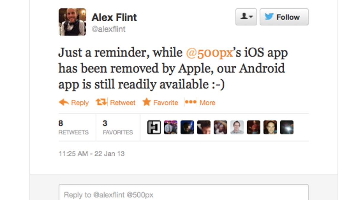 500px's Alex Flint seems equally frustrated. On Twitter he offered: "Just a reminder, while @500px's iOS app has been removed by Apple, our Android app is still readily available :-)"