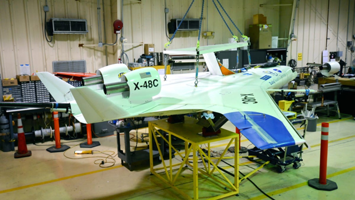 But now, the team has retired the X-48B and is getting ready to start flying a new version of the design, the X-48C. And with this plane, they've implemented some fairly significant changes. The B version of the plane was a blended-wing design featuring three engines and winglet vertical tails. The C version, which has yet to take flight, has evolved to be even more efficient, Princen said, and because its engines are moved forward in such a way that shields them, it's even quieter than its predecessor. "The engines are above aft center," he explained, "to make sound bounce up or to the side."