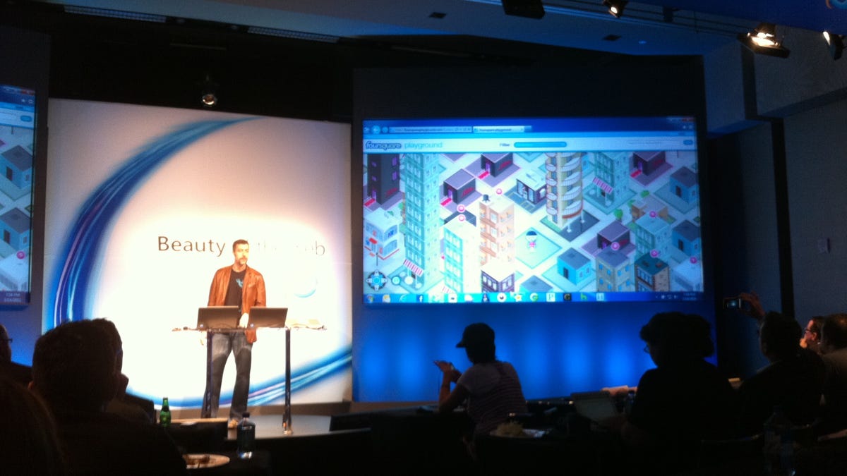 Microsoft representatives previewed the IE9-optimized version of Foursquare, the geolocation app that's been ubiquitous at SXSW this year (again) and has built "Foursquare Playground," a new Web application that uses an animated HTML5 3D map that can sense the user's location, display locations with high levels of Foursquare activity, and offer a business search that can jump out into Bing Maps (which already has a notable Foursquare partnership in place).