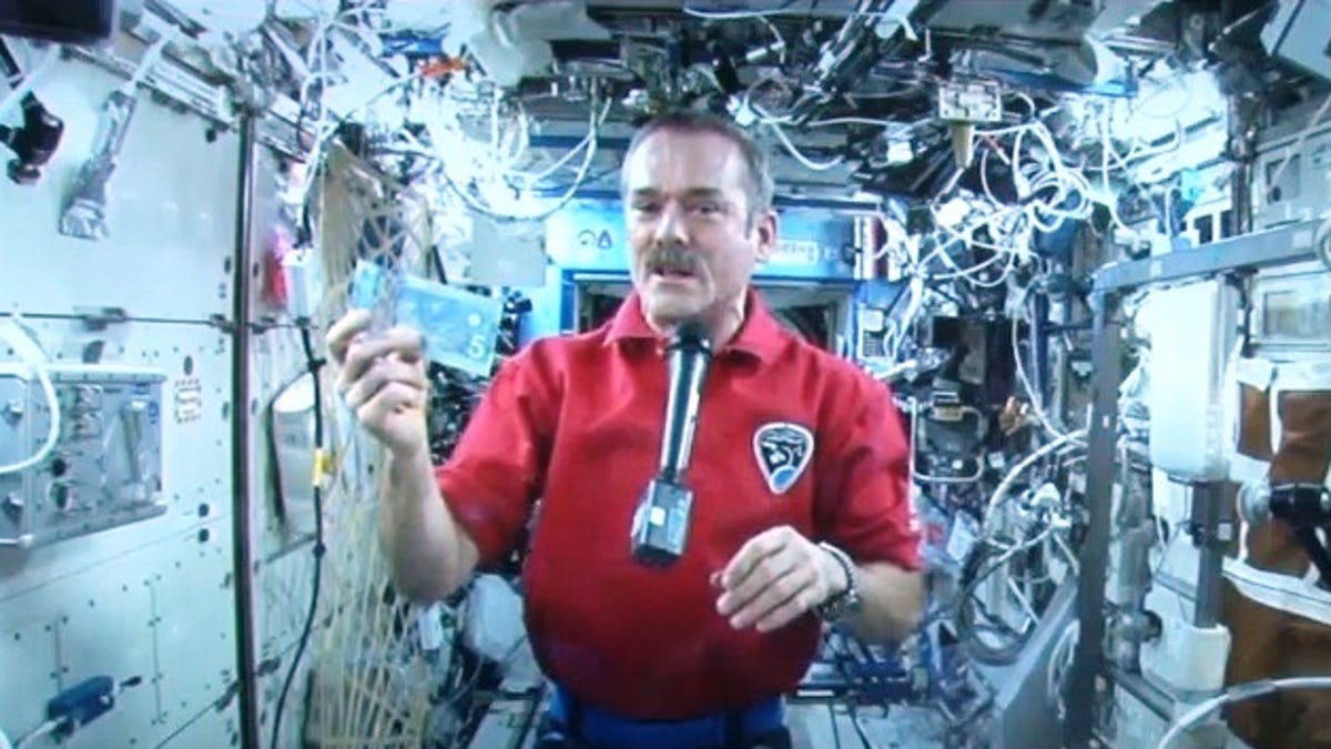 Today Hadfield notched another first: unveiling a banknote in space. At a Bank of Canada press conference in Ottawa, the mustachioed colonel appeared via ISS video link. He plucked the bank's latest polymer bill from a bracket on the wall, gave it a few weightless twirls, and pointed to the robots it features.