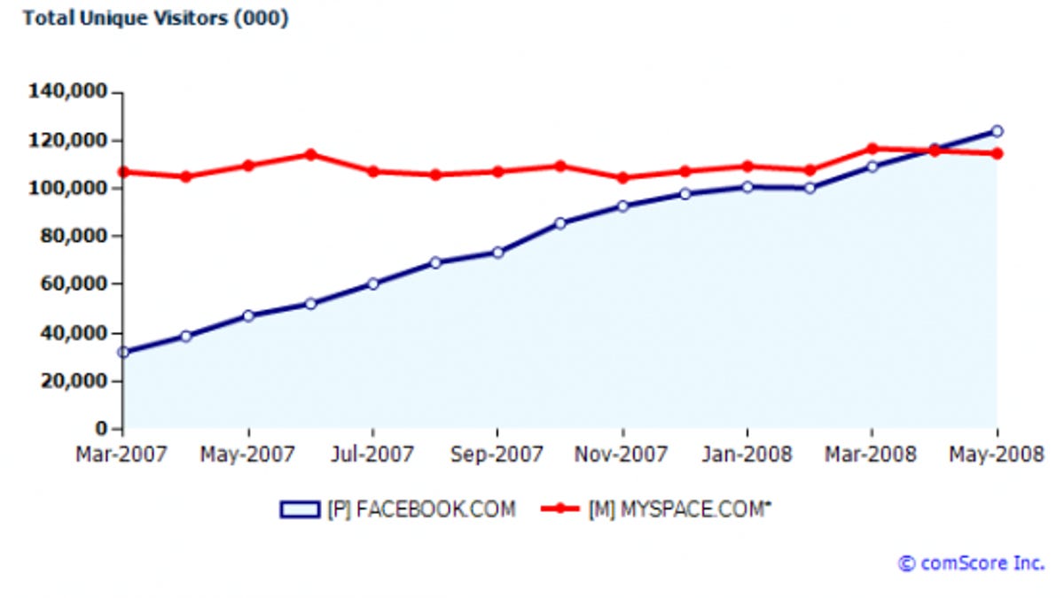Facebook, according to ComScore, pulled in 123.9 million unique visitors in the month of May, beating MySpace's 114.6, and 50.6 billion page views compared to MySpace's 45.4 billion. It's been a slow but steady upward climb for Facebook, which was founded by then-Harvard undergraduate Mark Zuckerberg in 2004. The site was restricted to members with e-mail addresses from a handful of elite universities before gradually expanding to the general public and becoming a genuine Silicon Valley sensation when it kick-started the developer platform craze last year.