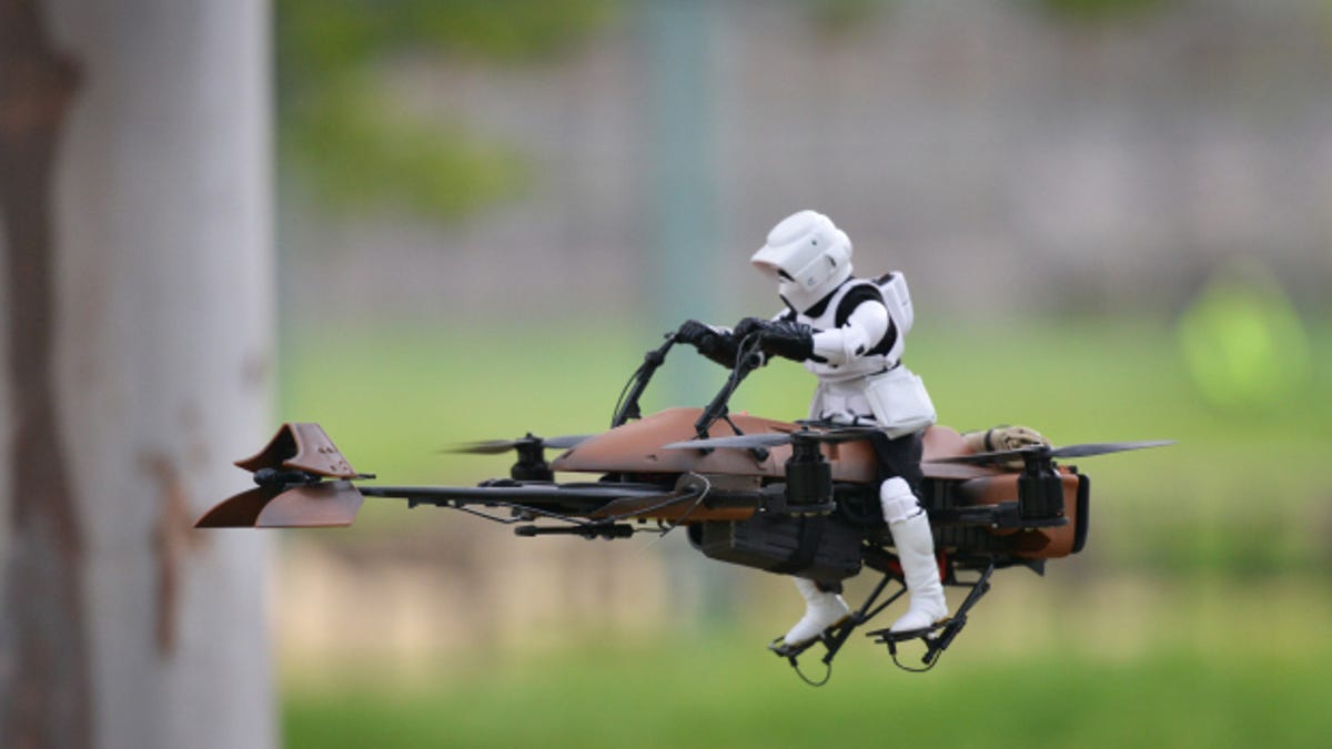 "Star Wars" fan Adam Woodsworth has constructed his own flying "Star Wars" Speeder Bike with a modified quadcopter and a Hasbro Power of the Force series toy.