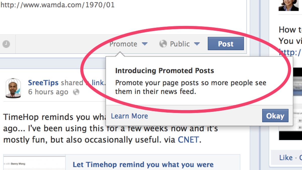 It's the new-to-me "Promote" button that has started showing up on SreeTips, my Facebook business page (I hate the term "fan page"; Eliza Cooper -- @ElizaIn140 -- a friend and social media consultant, helps me run the page). I say "new-to-me" because, with 900 million users, features get rolled out at different times to different users.