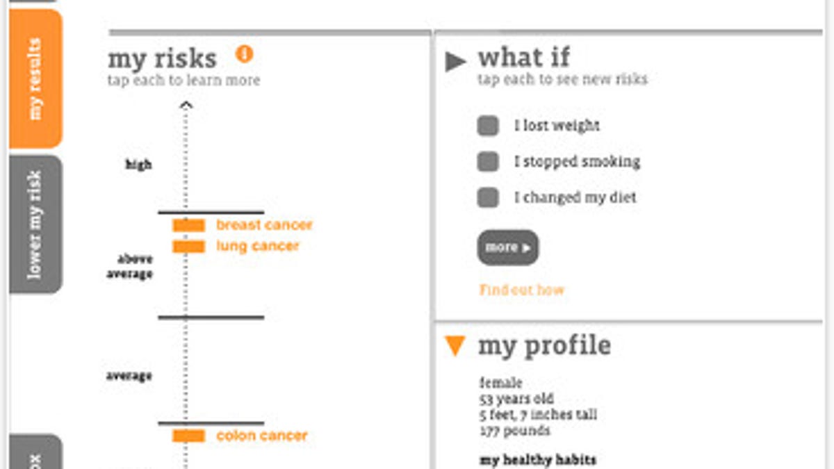 The app isn't terribly fancy. You complete a quick questionnaire about lifestyle habits (do you do x and if so how much -- i.e., smoke, exercise, watch TV, etc.), and lists the diseases you may be prone to, specific factors that tend to lead to these diseases, and specific lifestyle changes that could lower your risk.
