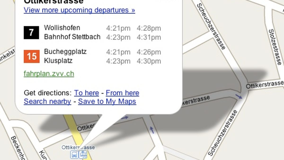 But that last feature's still being rolled out: test runs of New York, Boston, Chicago, Los Angeles, San Francisco, London, and Montreal yielded only a link back to the public transportation system's main homepage. You can, however, find departure data in several European cities, like Zurich (as Mashable discovered). In addition, you can search for a particular station by typing it into Google Maps, and it'll direct you right there.