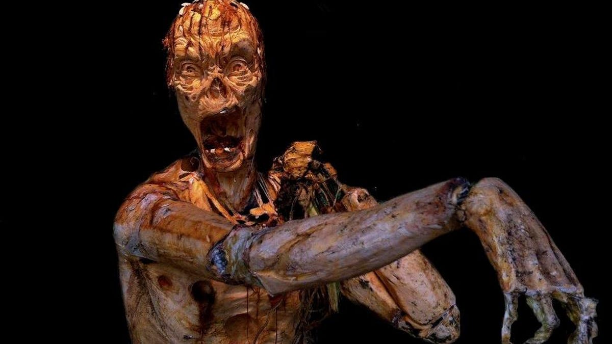 The zombie is depicted in excruciating detail, including its guts and rotting flesh, dragging a vine of monstrous pumpkin people out of the ground. It took three days to complete the scene.