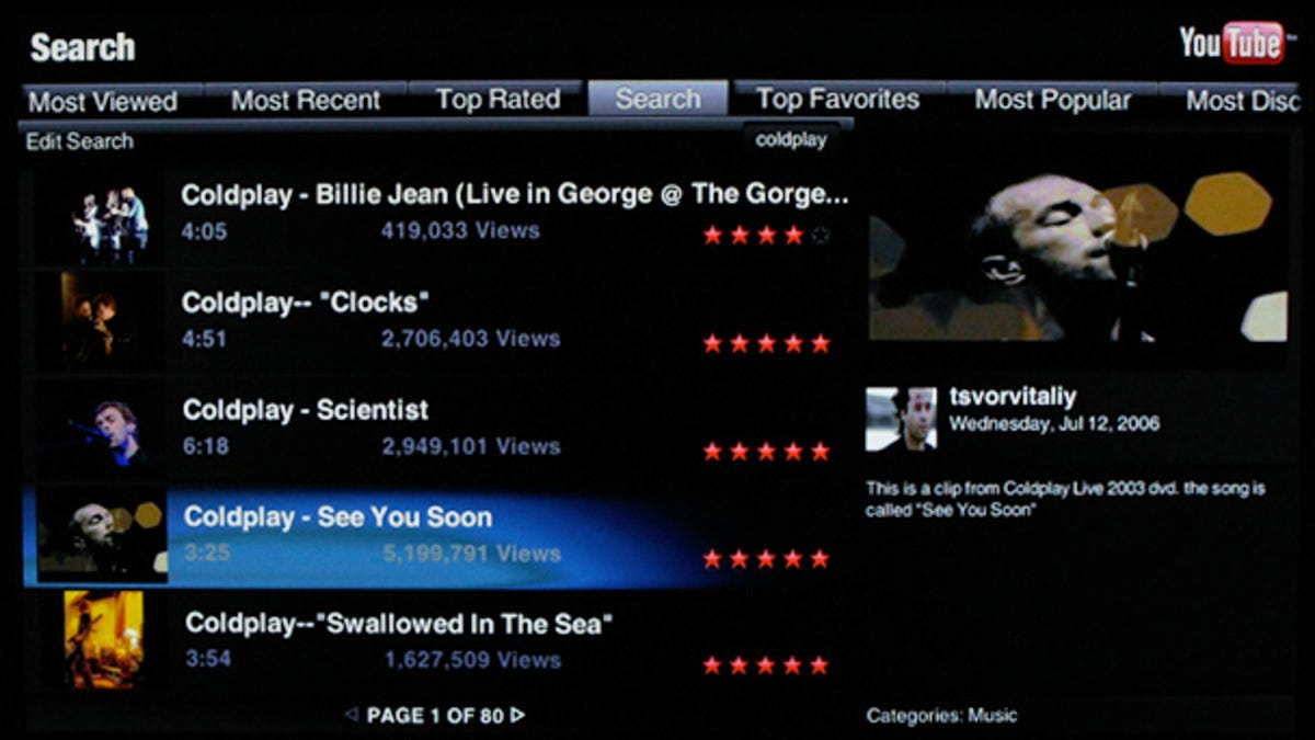 Ultimately though, the Web method is much more efficient. On the Web, typing "C" in the search brings up Coldplay as one of a few suggestions. Typing "Co" bumps Coldplay up to the first suggestion, and this will bring you to a number of music videos and concert clips. Accessing this same content on the TV, though, still requires that you type out the full word. We didn't get any Coldplay-related results until "Coldp" had been input, and even then they were mostly fan-made cover songs. To make matters worse, after each key press, the program freezes for a second as it updates the search results. While the search feature looks great, its sluggish and imperfect performance make this time-saving feature ultimately seem to do the opposite.