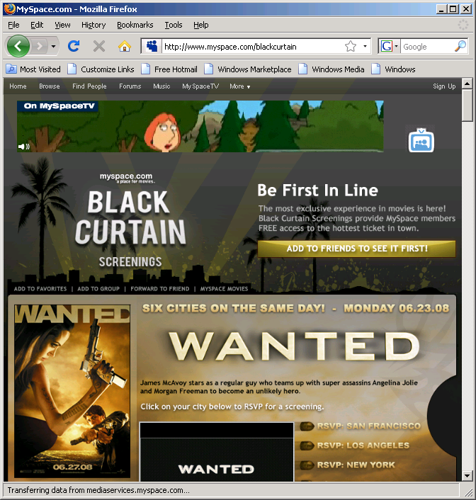 At least since last Friday (possible earlier), MySpace put up a Web page to invite people to a "BlackCurtain" screening of the upcoming movie Wanted at AMC Metreon in downtown San Francisco, which is five blocks from CNET's HQ. My co-worker Eric entered his name and soon enough he got the movie invitation e-mail from MySpace. The invitation is good for two and as we're both big fan for comic-based movies, we were excited.