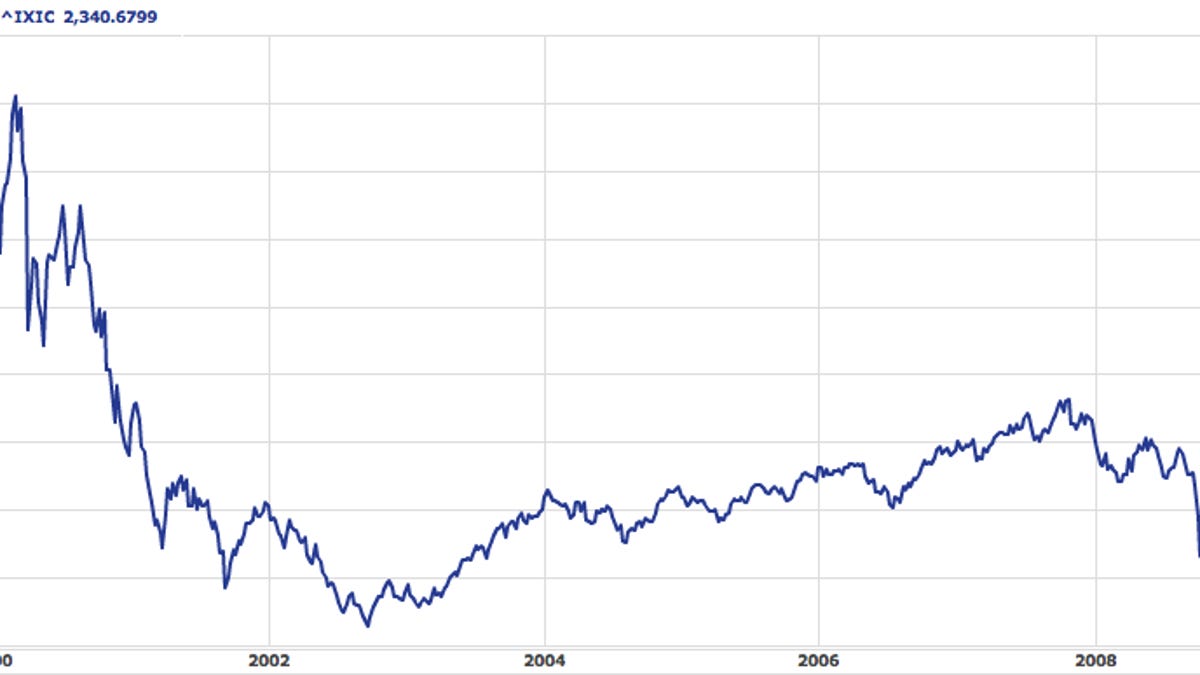 If you consider the devaluation of the U.S. dollar during that period caused by the Federal Reserve, the Nasdaq has dropped from an inflation-adjusted high of 6,352--an even more vertiginous plunge of 63.15 percent.