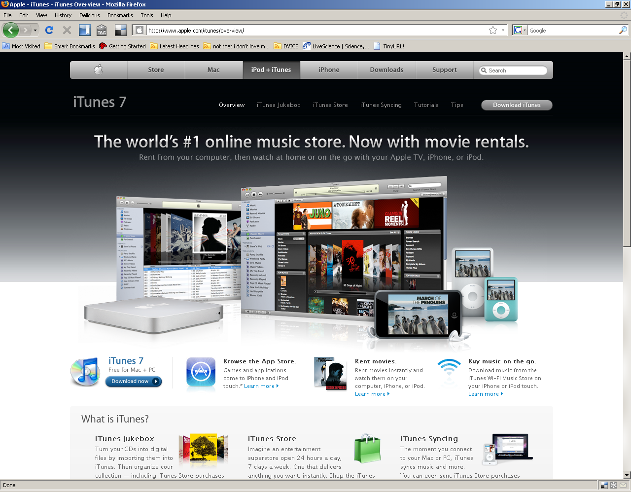 This is one program we're talking about, here. As a result, iTunes 7.7 is a 60.5MB file. Last time I did a fresh install, about a week ago, it took me 30 full minutes to download it, complete a full registration procedure (when all I was after was iPod syncing), get it installed, index my entire universe of music and its entire universe of online content, and get it up and running. When my husband recently bought an iPod Touch, it took him 45 minutes to update iTunes, re-register, and connect the new iPod.