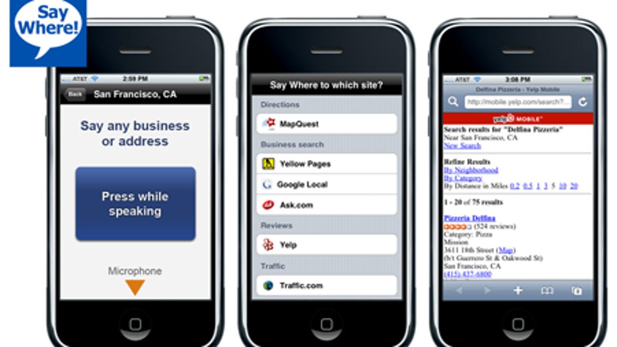 And on Monday, the company announced at DemoFall its Say Where iPhone app, a tool that allows owners of the device to use their voice to get information from several online service providers specializing in geographical information.