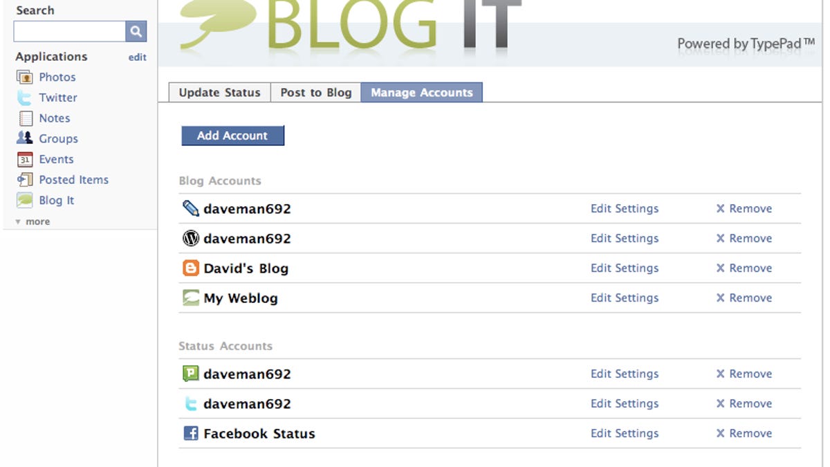 David Recordon, who holds the title of open-platforms lead tech at Six Apart, told me the thinking behind Blog It was "how we can start to bridge some of that gap between blogging and social networking." In its launch form, Blog It is a little bit limited, but seems to be on the right track; within its Facebook application, you can simultaneously update any Six Apart blogs as well as Google's Blogger, WordPress, LiveJournal (formerly owned by Six Apart), and a number of others.