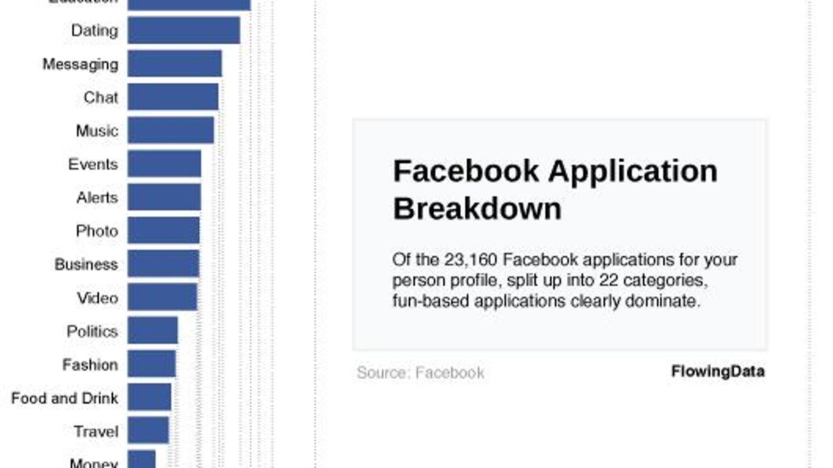 A new study from number-crunching firm Flowing Data did some eye-opening work recently, dividing 23,160 Facebook applications into 22 categories. A whopping 9,601 of them fall into Facebook's "just for fun" category, followed by "gaming" and "sports" with over 2,000 each. In other words, the majority of Facebook applications are goofy time-wasters.