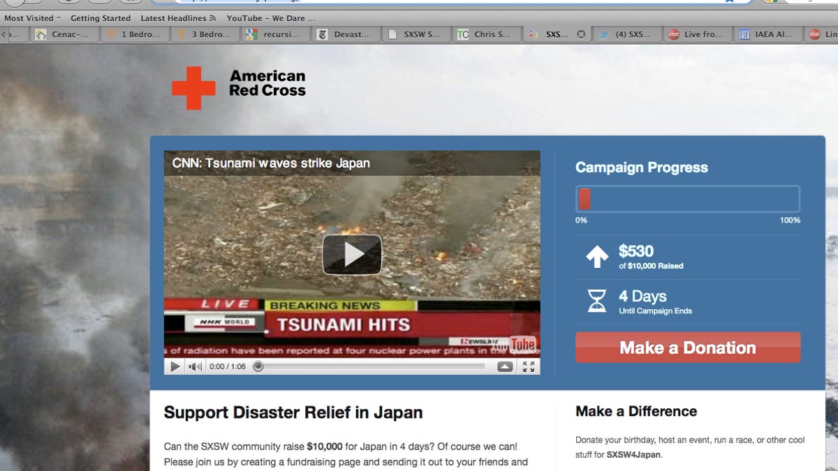 "Can the SXSW community raise $10,000 for Japan in 4 days? Of course we can," the site urges attendees. "We at SXSW Interactive can make a difference. We can raise funds for the American Red Cross to provide disaster relief in Japan. Donate now to the American Red Cross or create a fundraising page to raise support."