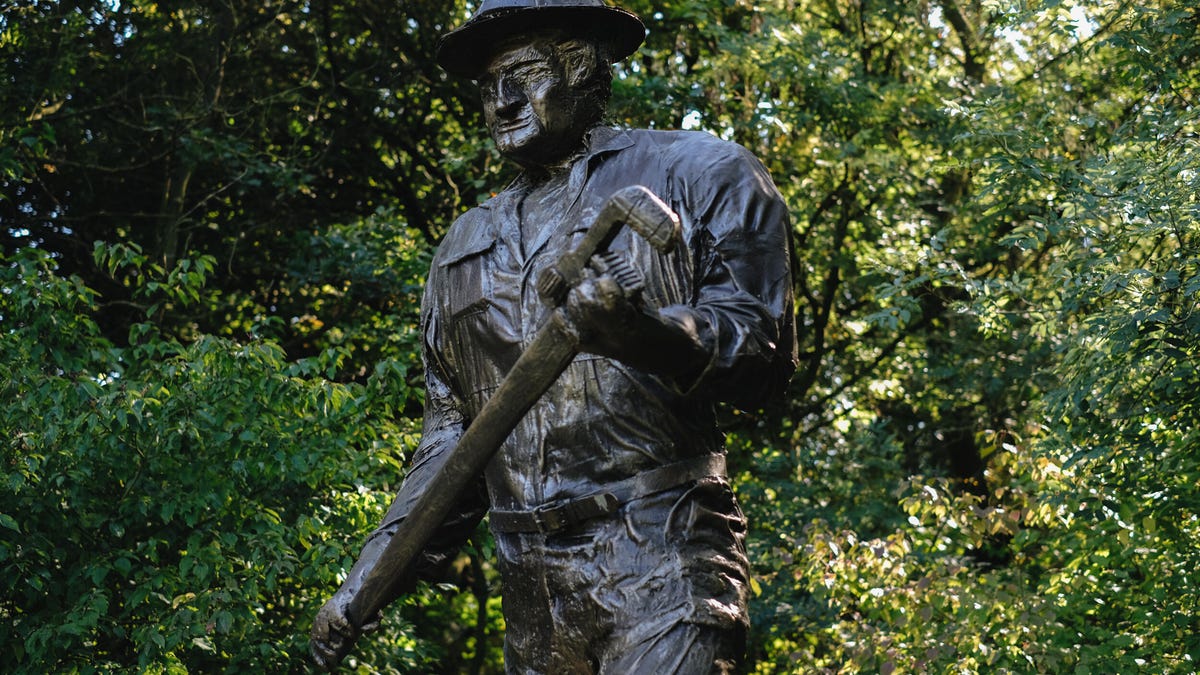 On a bright September day, a veteran of that historic conflict led me into a grassy clearing, and it took me a moment to spot strange long-abandoned machinery still camouflaged against the forest greenery. Then, near a dirt path winding through the trees, I saw a stout figure ready for action: a 7-foot statue of an oil worker equipped with a helmet and Stillson wrench and standing astride a base etched with 42 names.