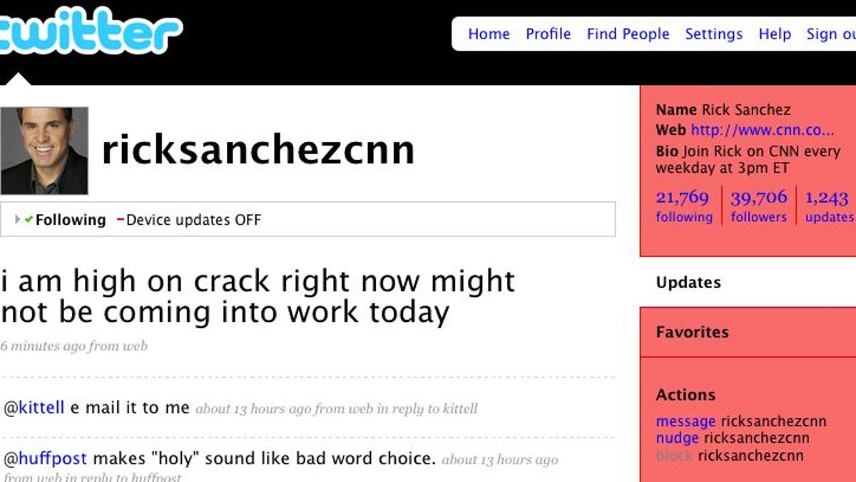 CNN anchor Rick Sanchez wasn't really high on crack this morning, and the reason his Twitter feed said so wasn't the phishing scam that's been going around--it was a lone hacker, the microblogging service said later on Monday.