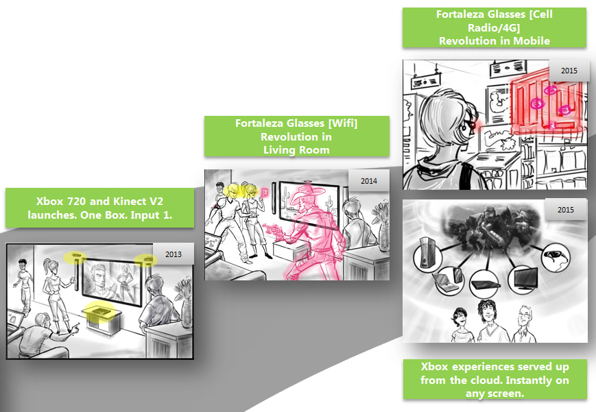 In 2014, the document suggests that Microsoft creates a "living room disruption" by releasing Kinect glasses (code-named Fortaleza) that connect to a smartphone synced with the Xbox 720 over Wi-Fi. Augmented-reality glasses working with a next-generation gaming console offers vast potential, with an example of someone battling lifesize virtual hologram characters in the living room viewable through the specs. This aligns nicely with the previous rumor we covered in March -- "Is Microsoft working on gaming helmets and eyewear?"
