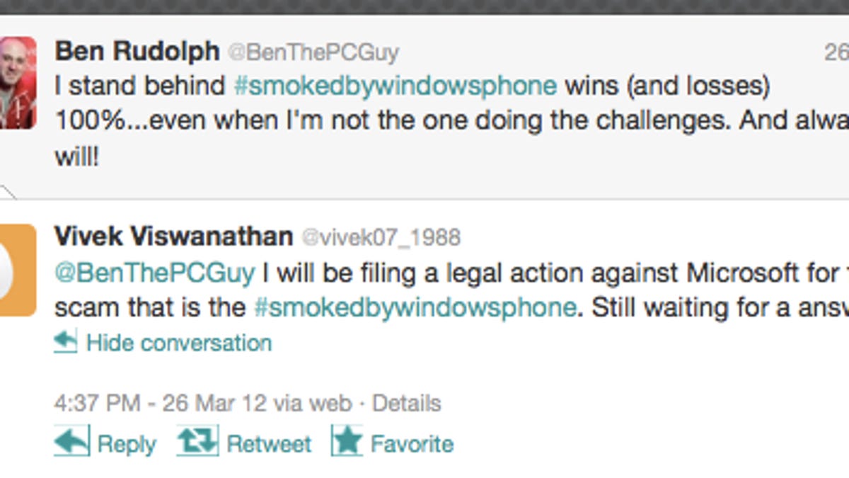 Microsoft's fine and entertaining "Smoked by Windows Phone Challenge" has caused one man to retain legal representation.