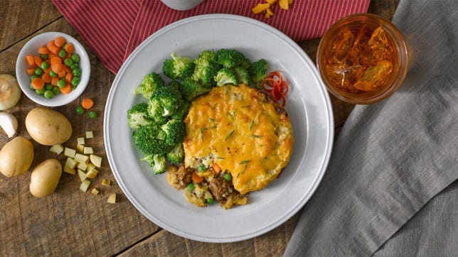 Pulled BBQ beef with mashed potatoes and green beans: The beef was mostly tender. The mashed potatoes needed salt and the beans were just a bit overcooked, but this dish was still a hit.Â