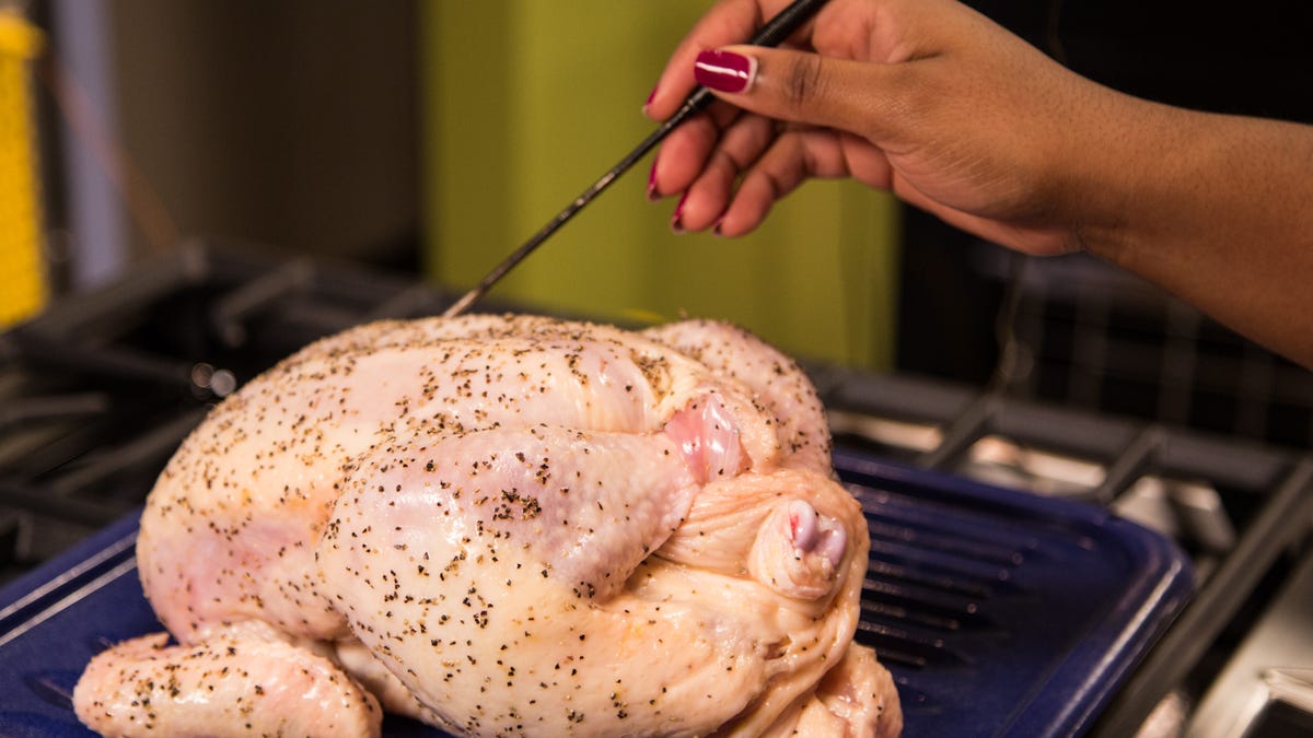 For our roasting test, we use a whole chicken that weighs about 5.5 pounds (about 2.5 kilograms). We follow this recipe, but only use salt, pepper and olive oil to season the chicken. We truss the chicken, place it on a roasting pan and roast it at 425 degrees F (218 degrees C). We use thermal probes in the chicken's breasts to track the internal temperature of the chicken. The probes are connected to our integrated system so we can track the temperature as it cooks. We remove the chicken from the oven once it has reached 165 degrees F (74 degrees C), the US Food and Drug Administration's recommended minimum temperature for cooking poultry, and record how long it took to reach that temperature. If either probe measures under that, we record the additional time required to hit temperature.