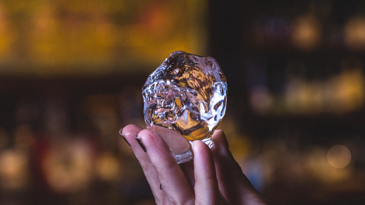 This orb of hand-chiseled clear ice has a very stable molecular structure which fridge ice can't match.