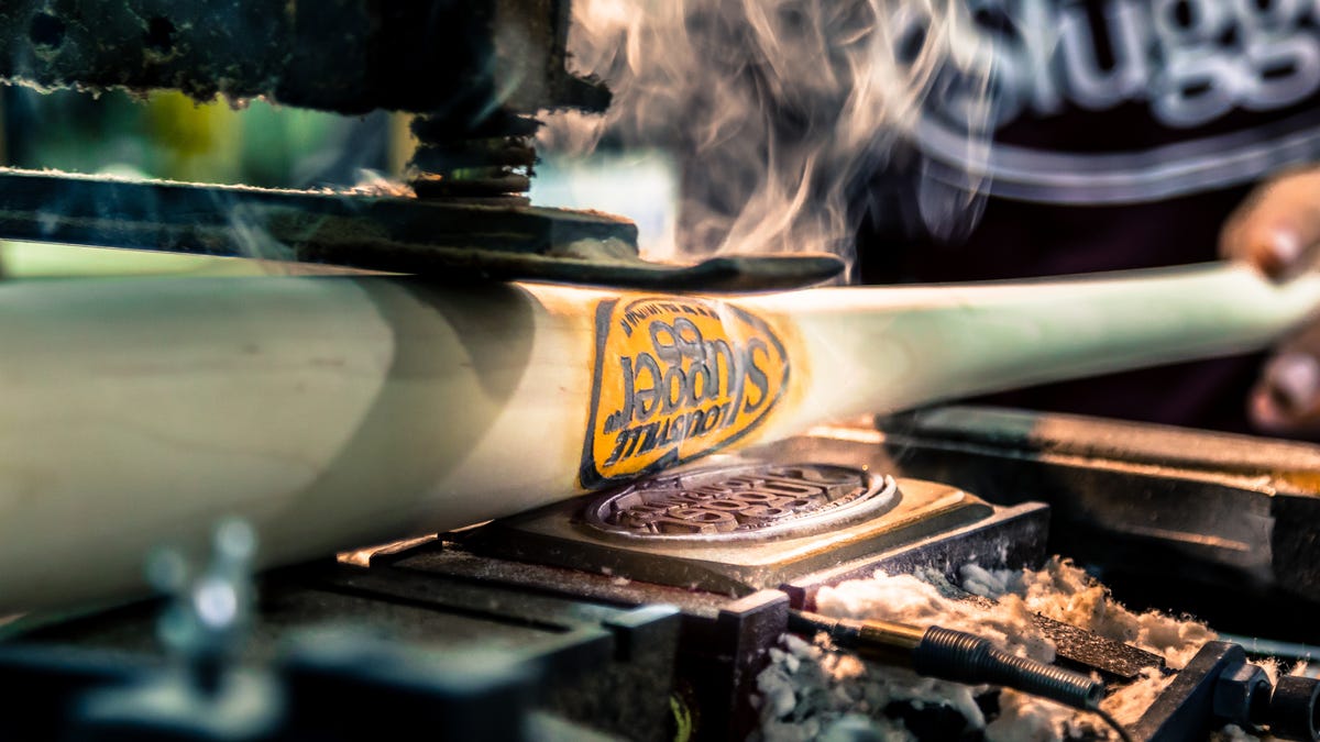 On an April afternoon, I watch as factory workers spray racks of retail bats black and red. Elsewhere, people are hand-branding blond wood bats with the Louisville Slugger logo.