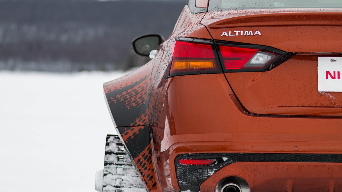 To make tackling the snow a breeze, Nissan outfitted its concept with snow tracks instead of regular ol', you know, wheels. The tracks are each 48 inches long and 30 inches tall, giving the Altima just a bit more height than usual. There's also a 3-inch lift in there to ensure the tracks fit in the first place.