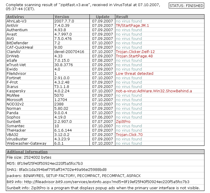 The last time I used Virus Total, a free service from Hispasec Sistemas, it scanned my suspicious file with 29 different programs. The list included popular antivirus software from Symantec, Kaspersky and Clam, some less well-known products such as NOD32, Avast and Panda, and a host of products that I had never heard of such as DrWeb, Ikarus and TheHacker. That's the good news.