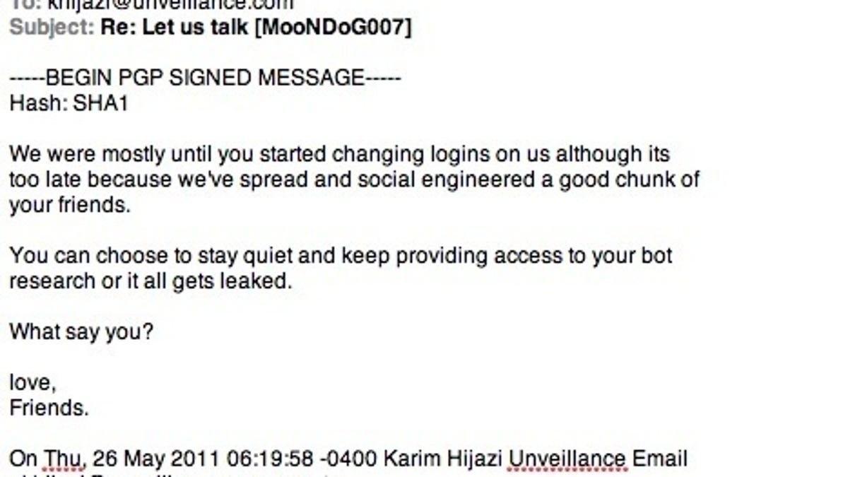 That would mark the beginning of a weeklong saga of e-mail exchanges and Internet Relay Chat (IRC) discussions in which Hijazi says a group of hackers told him they wouldn't publicly divulge information they had gotten from snooping on his accounts if he revealed sensitive security information acquired by the botnet-tracking firm, Unveillance, that he launched last year. The hackers, who call themselves LulzSec, wanted to know the whereabouts of compromised computers on the Internet that when remotely controlled are used en masse to attack Web sites, he told CNET in an exclusive phone interview late last night.