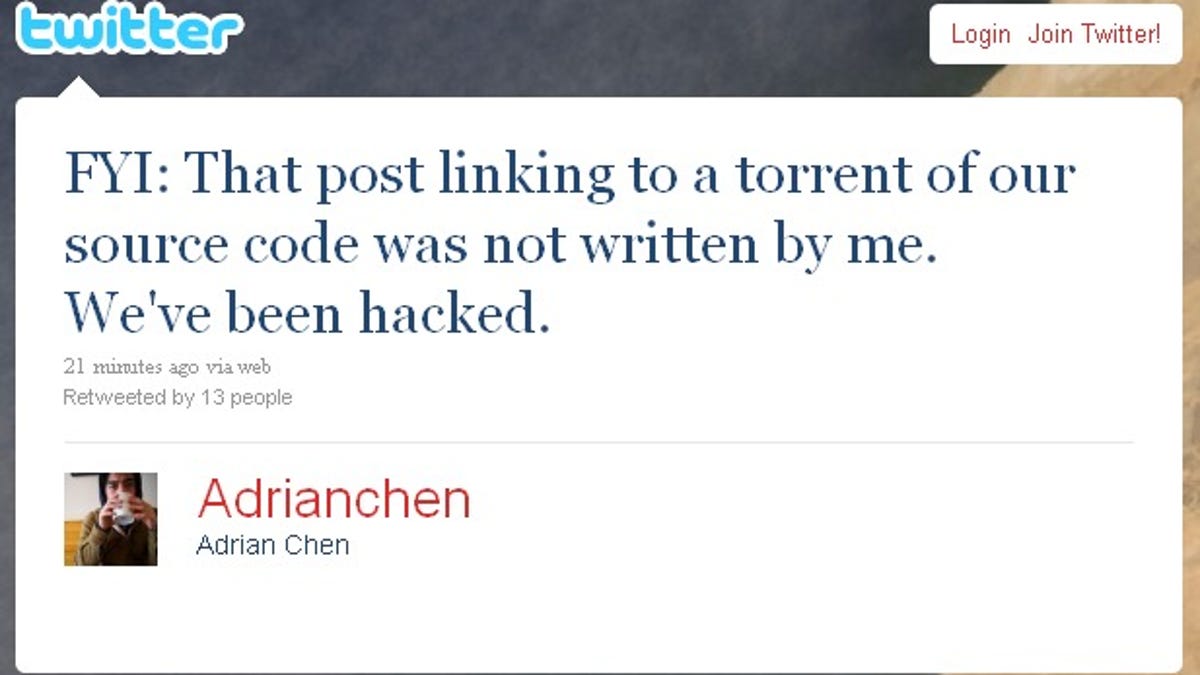 Later in day, it was revealed that the site itself was compromised as well when a post appeared there reportedly linking to the site's source code at The Pirate Bay. The story appeared under the byline of Gawker writer Adrian Chen, but Chen tweeted that he had not written the story and the site had been hacked.