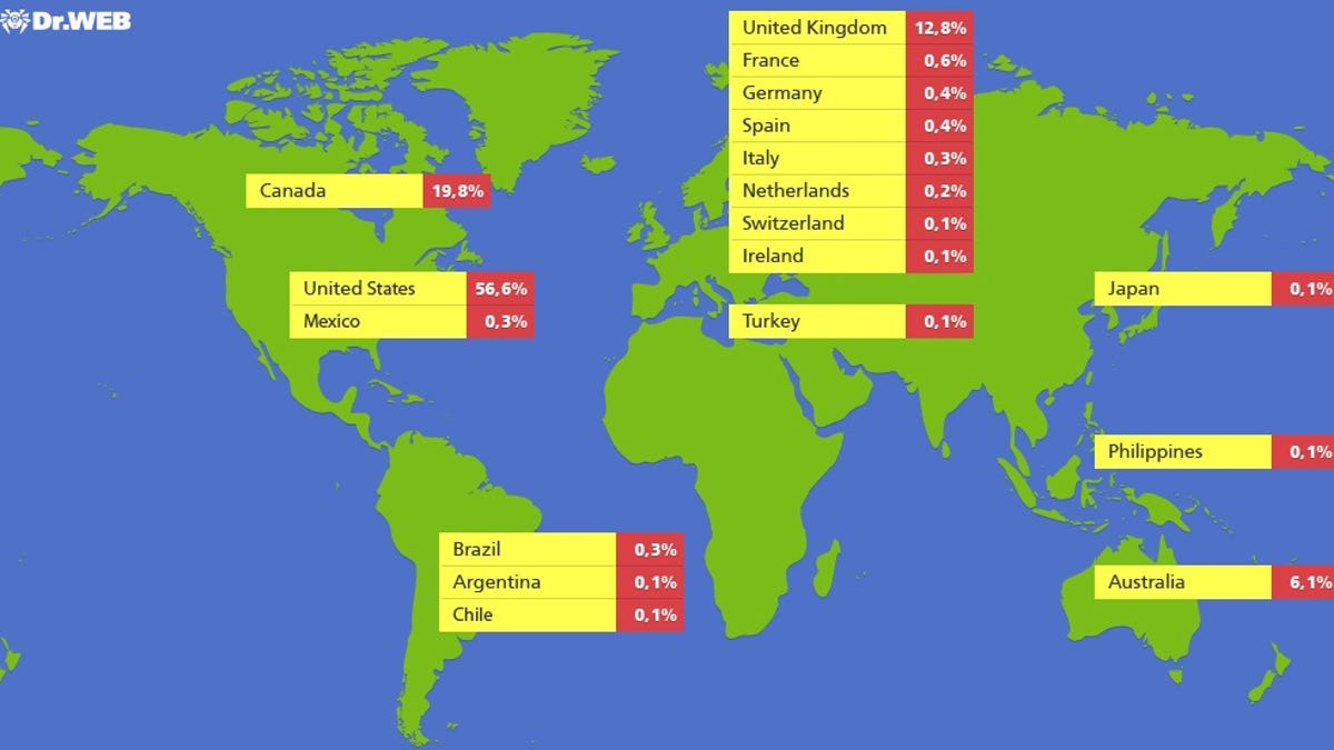 More than half of the Macs infected are in the United States (57 percent), while another 20 percent are in Canada, Dr. Web said.