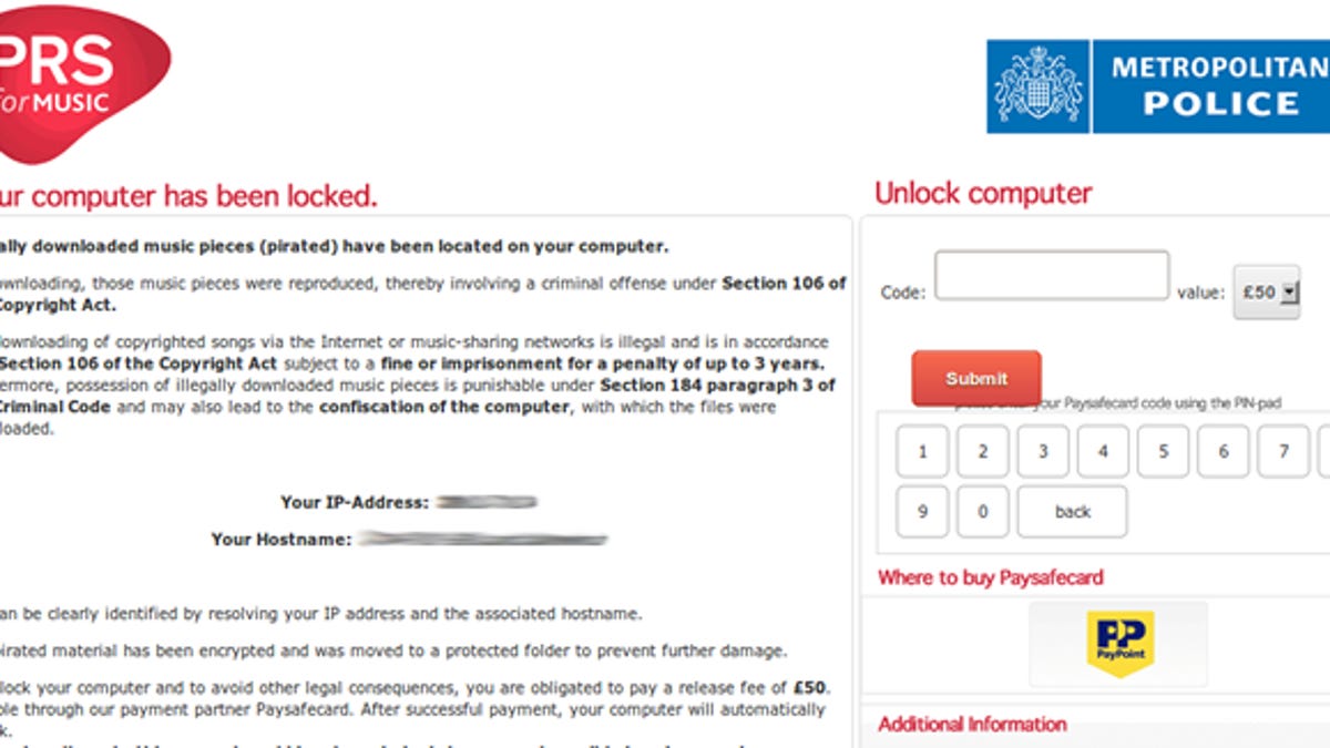 The message aimed toward those in the U.K. further says that "to unlock your computer and to avoid other legal consequences, your are obligated to pay a release fee of 50 pounds," around $80. The directions instruct the user to submit payment using an online payment system called Paysafecard. The message itself tries to look official with a logo of the Metropolitan Police at the top.