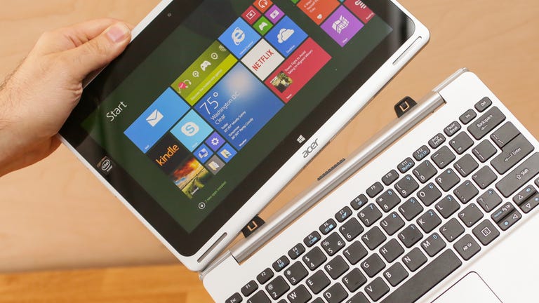 Acer says its Switch 10 hybrid is especially flexible and built to work in four distinct modes. That may be a somewhat generous description, but it's similar to what other detachable or Yoga-style hybrids can do. There's the traditional clamshell mode, then the screen pops off and can be replaced facing outwards, forming a kind of kiosk mode, which Acer calls "display" mode. The kiosk shape can be flipped upside down to form a table tent, a form commonly cited by PC makers, but one that I've never seen a hybrid owner use in real life. Finally, the screen can detach as a full standalone slate-style tablet.