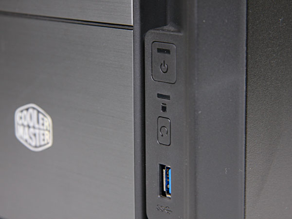 The power and reset buttons, and the USB 3.0 port. The other side has two USB 2.0 ports, and headphone/microphone jacks.