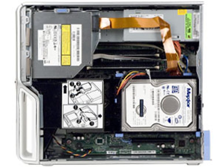 The Dimension 5150c's internal layout is very different to that of an ordinary PC. True to its BTX roots, there's a fan located at the front of the case that draws cool air over the processor and motherboard chipset in a very efficient manner.