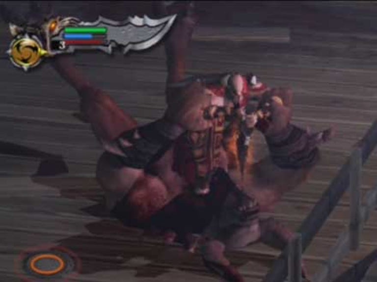Kratos can also perform special combos on enemies which result in even more satisfying action. After an enemy has been dealt a certain amount of damage, a Circle symbol appears over that enemy's head. In some cases, pressing the Circle button will trigger a special finishing move action, such as Kratos grabbing an undead soldier and snapping him in half. With bigger enemies, pressing Circle will trigger a short mini-game where players have to press a combination of buttons or move the joystick in a certain direction to succeed. With a Cyclops for example, pressing the right button combo will result in Kratos ducking the giant's sword, climbing onto its back, and then delivering a killing blow to the Cyclop's face -- fail to complete the button combo and he'll simply be thrown off the creature's back. It's an extremely satisfying system that rewards your skill and reflexes, as well as adding another layer of visual cool to Kratos.