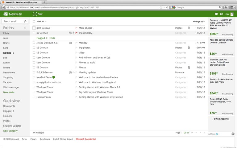 For the most part, the photo preview worked, though I did get one 10MB message from which only one thumbnail out of five downloaded correctly. Besides 7GB of cloud storage, the SkyDrive (more on that app later) integration is supposed to support up to 300MB of attachments per message, much more than Gmail allows, so it shouldn't have been a problem. As I mentioned, Microsoft promises that you'll get virtually unlimited storage. I'm not sure why the company adds a qualifier, but there is not supposed to be a hidden cap, as there is for some "unlimited" cell phone data plans. But in any case, that's more than the 10GB of storage you get through Gmail (which was a big deal when Gmail debuted).