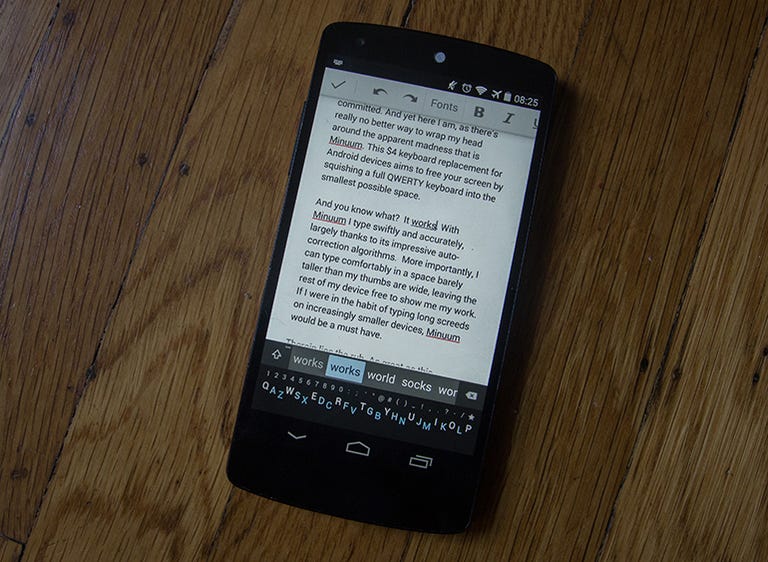 Writing a CNET review on a mobile phone is a good way to drive yourself mad. And yet here I am, as there's really no better way to wrap my head around the apparent madness that is Minuum. This $3.99 keyboard replacement for Android devices aims to free your screen by squishing a full QWERTY keyboard into the smallest possible space.