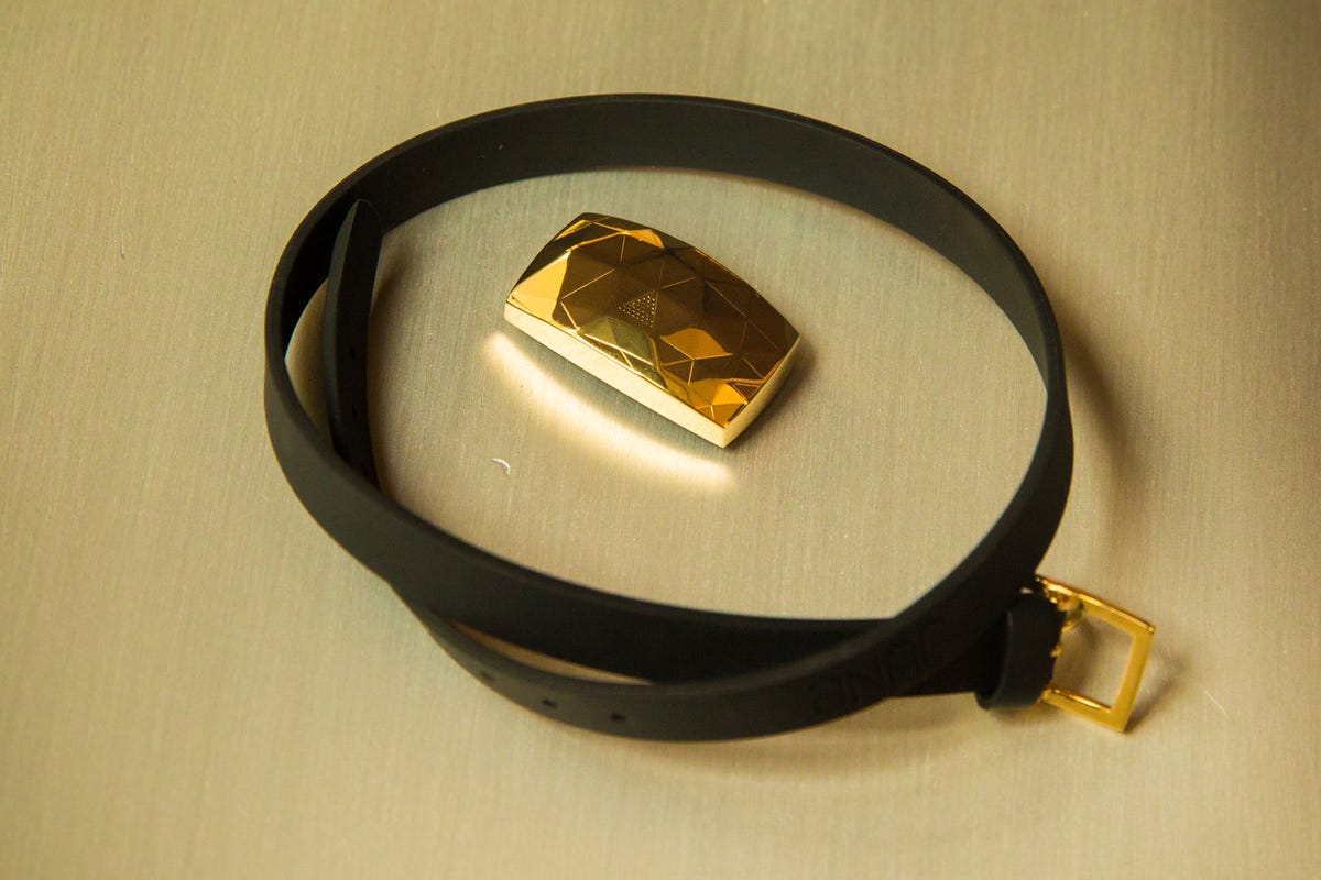The June looks more like a piece of jewelry and less like a health tracker. The design is undeniably feminine, with a shiny metal jewel (Netatmo calls it a centerpiece) and thin wristband that wraps around your wrist twice. Netatmo compares the centerpiece's design to a diamond and indeed the metal housing for the sensor is faceted like a cut gem. There's a clasp on the black that slides onto the wristband and it can also attach to a pocket or shirt collar. The June comes in three colors, gold, silver and dark gray and I tested the gold model.