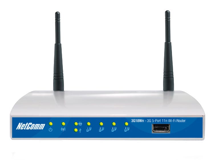 The 3G18Wn is a mid-sized router that shares NetComm's recent obsession with small white boxes that feature front blue panels. The big visual difference between the 3G18Wn and other NetComm routers is the presence of a USB port at the front to accommodate a 3G modem. At the rear you'll find four 10/100 Ethernet ports and a single 10/100 WAN port for attaching a secondary internet source such as ADSL or cable. That does, as the box proudly proclaims, make the 3G18Wn a "five-Ethernet port" router, although we suspect anyone buying it on that selling point might expect it had five outbound ports rather than the more regular four plus one WAN port. Two antennas stick up from the rear of the 3G18Wn. Aside from the router and its power adapter, all you'll find in the box is a very slim set-up sheet, some advertising material for other NetComm products and a CD containing product manuals.