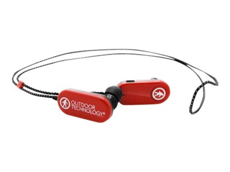 The individual earpieces are roughly 1 inch long and 0.5 inch wide, and the two earbuds are joined by a long cord that wraps around the back of your neck. A small plastic clip lets you link the two together, and Outdoor Technology encourages letting the two earpieces hang down when you're not listening, hence the "Tags" moniker that comes from the company's design inspiration: the military identification tags known as dog tags.