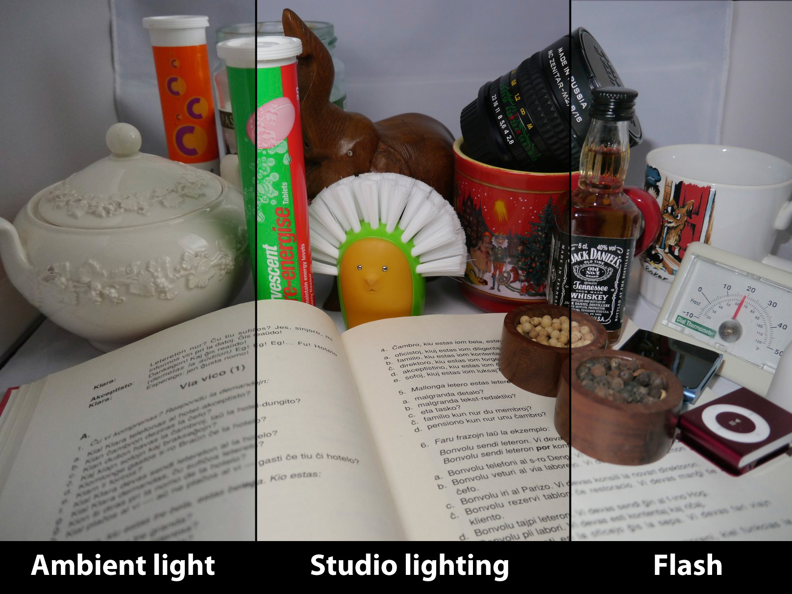Turning to our regular still-life test, we shot a collection of everyday objects, once under studio lighting and then again using available ambient light and the GX1's onboard flash, which pops forward and up from the top of the body on an articulated arm so that the protruding lens barrel won't cast a shadow on your subject.