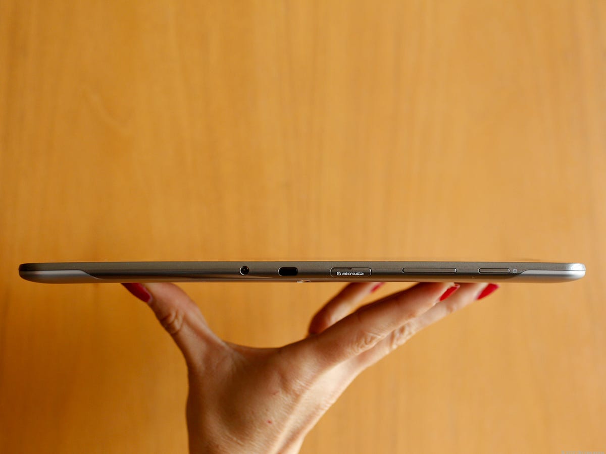 The tablet feels comfortable in my hands, but it's a bit wide and feels awkward when trying to type and hold at the same time, even if you sport alienlike Arsenio Hall-long fingers, like me. Also, the bezel isn't completely flush with the outer casing of the tablet, creating a slightly annoying edge.