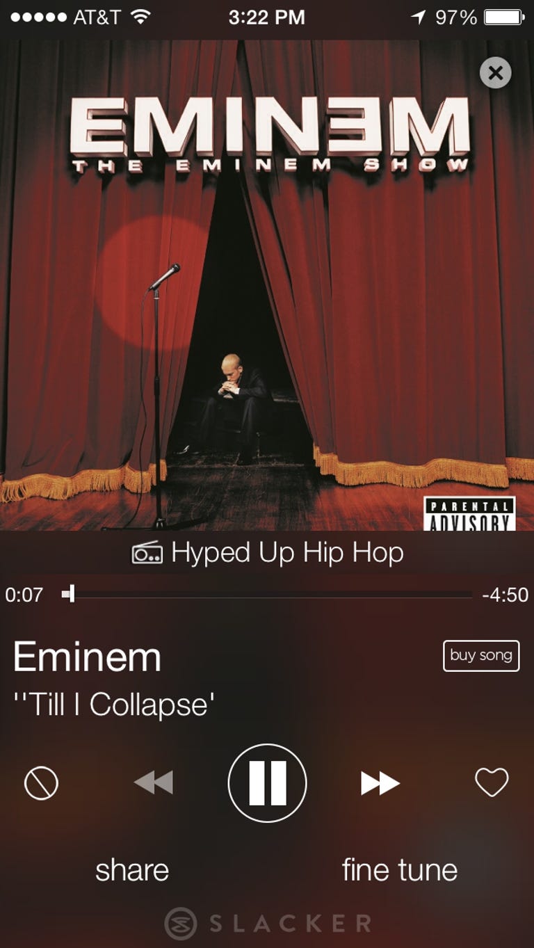 New to Slacker's arsenal and available to all users is a nifty feature called My Vibe, which helps you find the perfect playlist to match your mood or activity. Similar to Songza, My Vibe starts by offering you a few suggestions based on the current day and time. From there, it gives you a menu of options that may or may not match your activity or mood. For instance, as I write this, I'm listening to a playlist that was suggested for someone who is working in the office on a Friday afternoon. So far, My Vibe seems to have fewer playlist suggestions than Songza. But still, the feature is nice addition to Slacker's fast-growing tool belt.