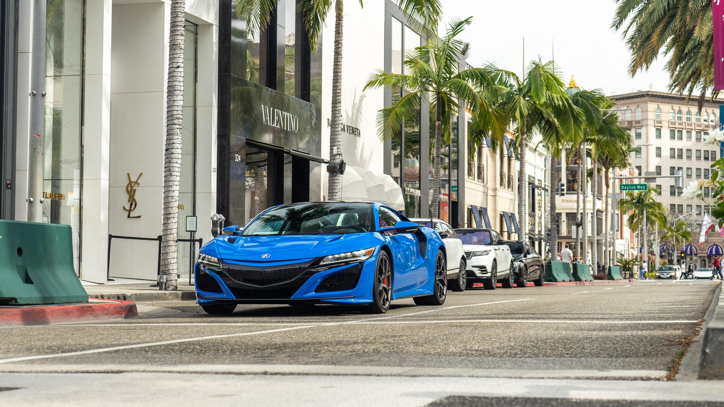 It's a busy day with lots of people walking around, window shopping and standing in line to get into Louis Vuitton, Chanel and Hermès. I do half a dozen laps around the block so Ben can get some rolling shots, and the NSX is breaking necks. The Long Beach Blue paint certainly has something to do with it, but the NSX seems to get a disproportionate amount of attention compared to the other supercars that are tootling around. A Ferrari 458 Spider and LamborghinI Huracan Performante Spyder are blasting around side by side, and people are mostly just looking at them in annoyance.
