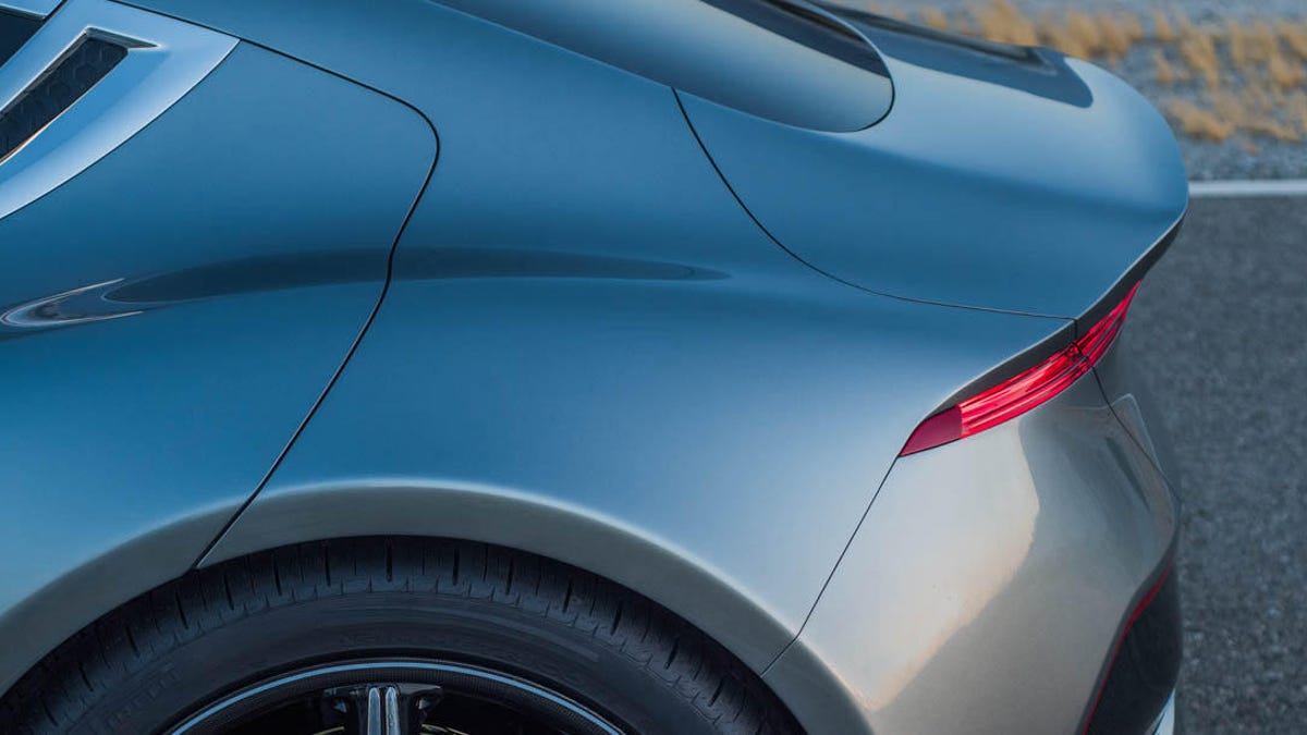 Compared to the renderings we saw in 2016, the front end is a fair bit more subdued. Gone are the wild vents and creases, replaced with smoother panels that should contribute to aerodynamic efficiency. The headlights are a bit larger than in the renderings, as well, likely due to packaging constraints. In the dead-front teaser, you might notice that the Fisker badge is slightly off-center. Don't worry, it's bothering me, too.