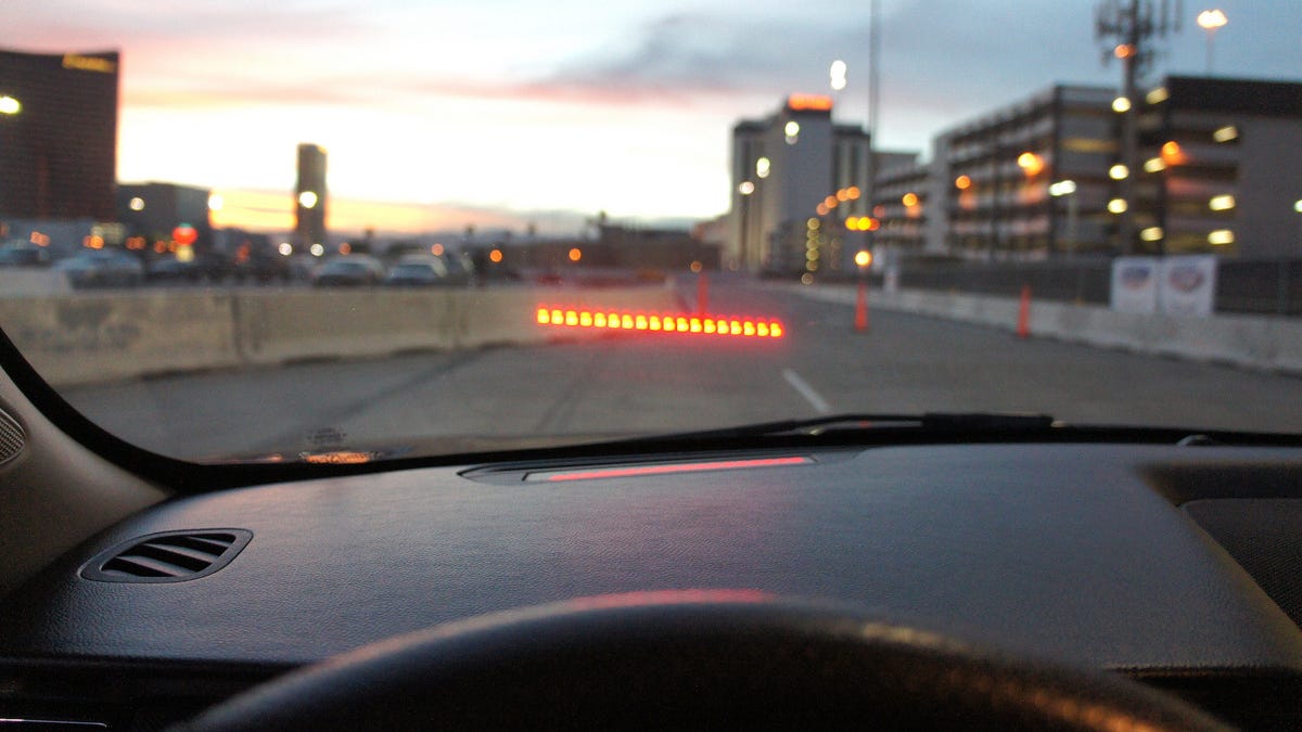 LAS VEGAS -- I'm sitting in the passenger seat of a Ford Taurus as the driver accelerates toward a green light. Suddenly, a red warning light flashes on the windshield and an alert tone sounds off. The driver hits the brakes, and another car goes flying by, across our path at the intersection.