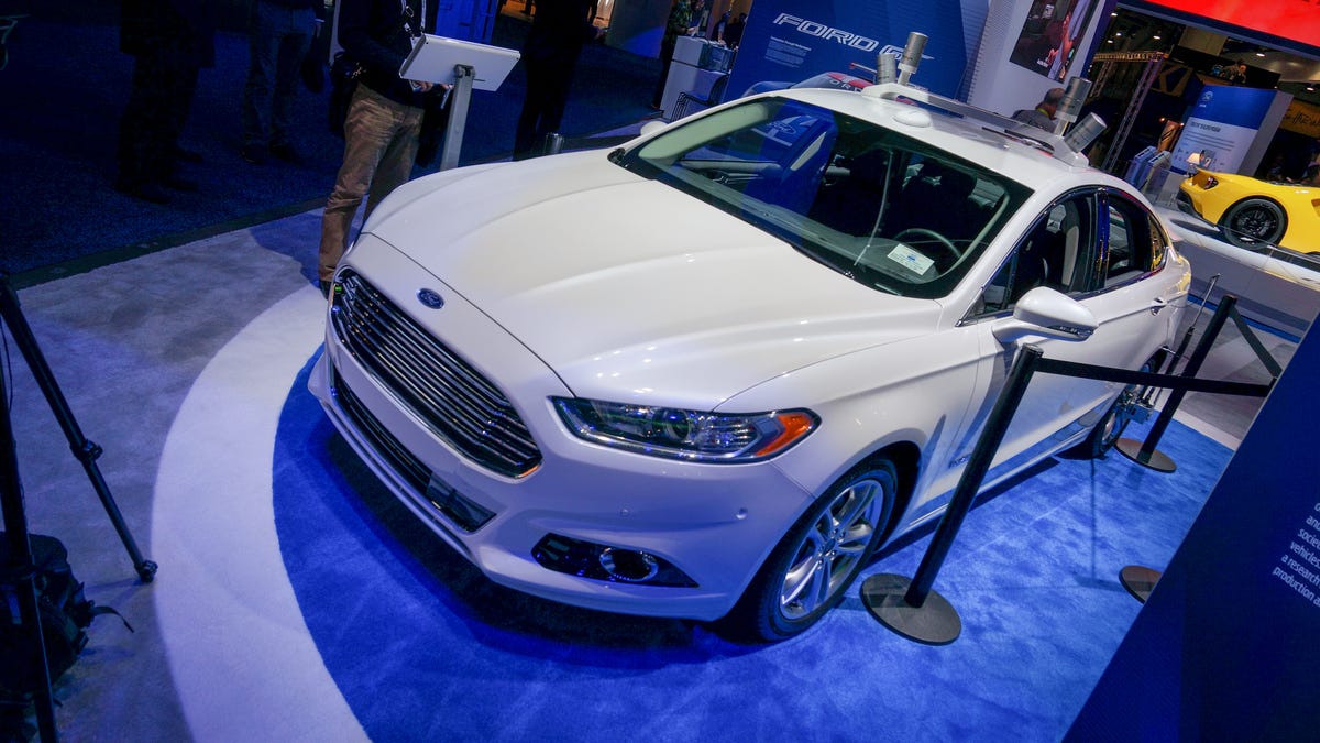 This Fusion is one of Ford's early autonomous test cars. At CES 2016, Ford unveiled a new generation of solid-state LIDAR sensors that are half as large as the cans on the roof of this example.